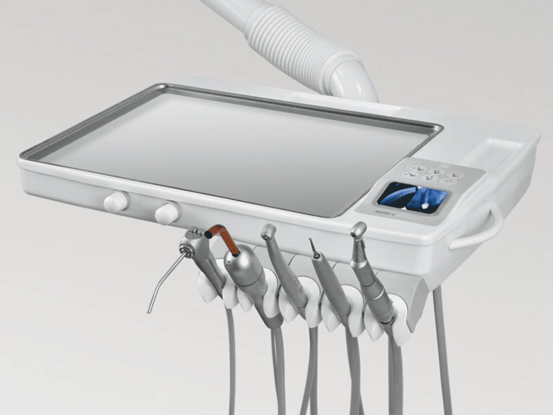 Jeringa triple y dos salidas neumáticas con acople Borden (una con agua para refrigeración), ofrecemos opcional una Lámpara polimerizadora Lucerna LED, otra salida neumática y un Cavitador Ultrasónico (pueden ser cinco los instrumentos). Micromotor eléctrico opcional en lugar de una salida neumática.